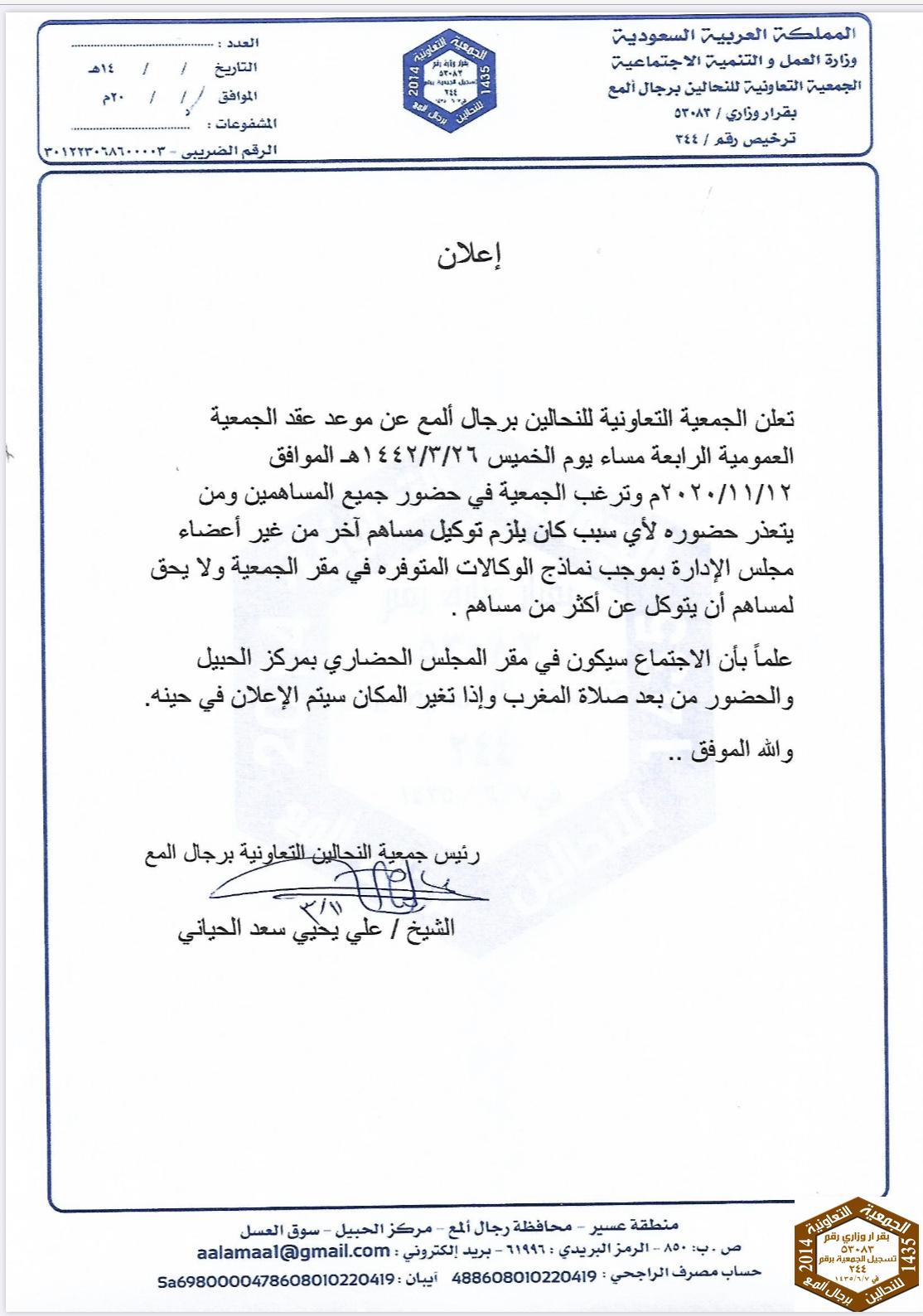 تعلن الجمعية التعاونية للنحالين برجال ألمع عن موعد عقد الجمعية العمومية الرابعة مساء يوم الخميس 26-3-1442هـ الموافق 12-11-2020م وترغب الجمعية في حضور جميع المساهمين ومن يتعذر حضوره لأي سبب كان يلزم توكيل مساهم آخر من غير أعضاء مجلس الإدارة ولا يحق لمساهم أن يتوكل عن أكثر من مساهم .
