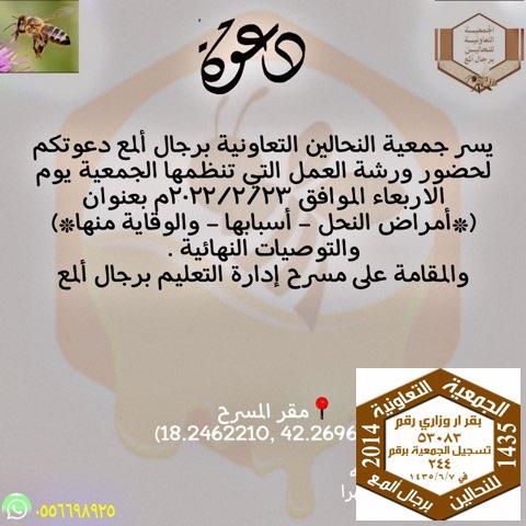 الجمعية التعاونية للنحالين برجال المع ستعقد ورشة عمل تحت عنوان (امراض النحل - اسبابها - والوقاية منها يوم الاربعاء22-7-1443هـ الموافق 23-2-2022م على مسرح ادارة تعليم رجال المع وسيبدأ تسجيل الحضور من الساعة الثامنة صباحاً وتبدأ الورشة من الساعة 9 الى 12 ظهراً يتخللها فترة راحة وفي نهاية الورشة يتم تدوين التوصيات لرفعها للجهات ذات الاختصاص .