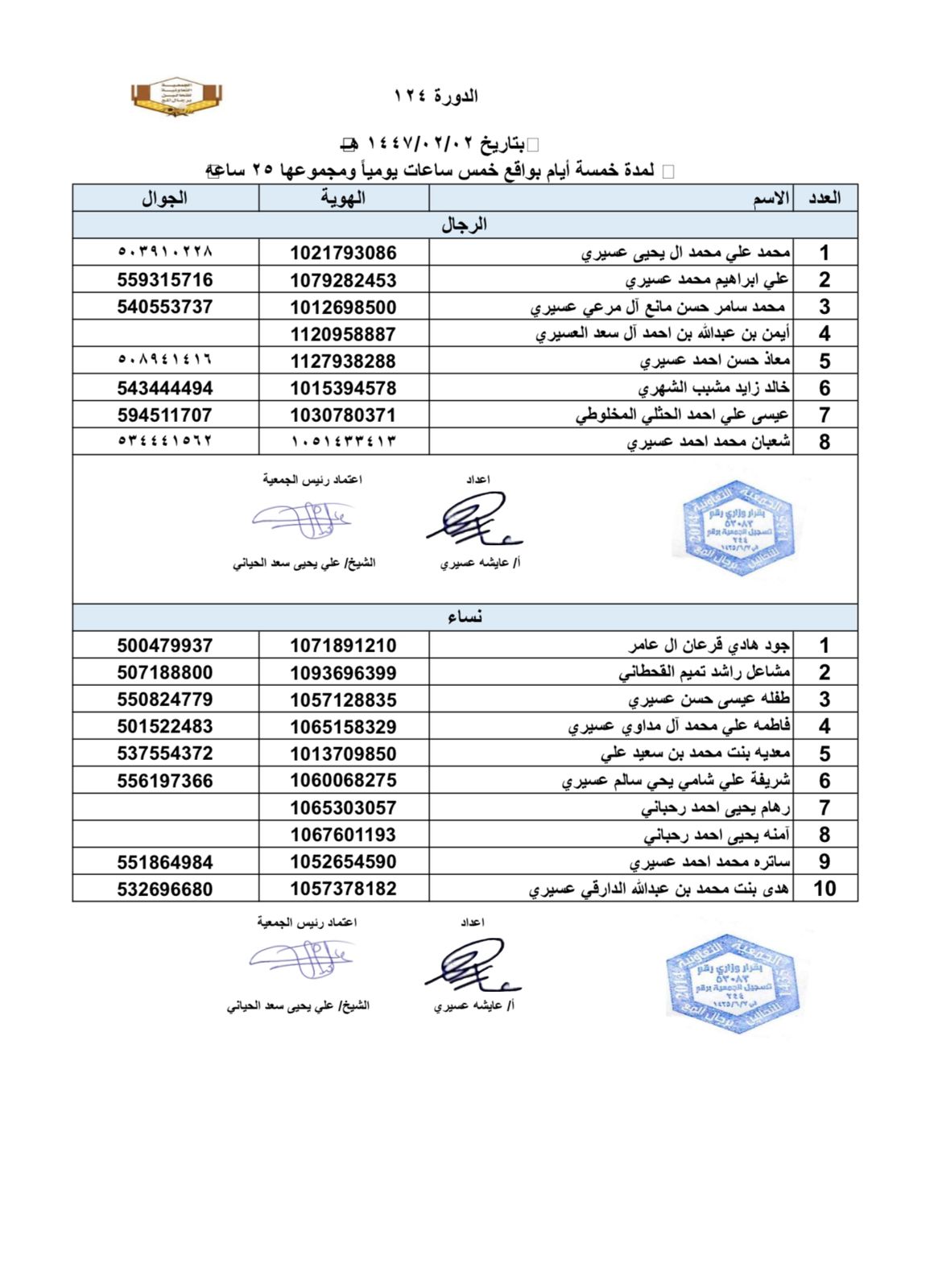 افتراضي اسماء المتدربين والمتدربات في دورة اساسيات تربية النحل رقم 124